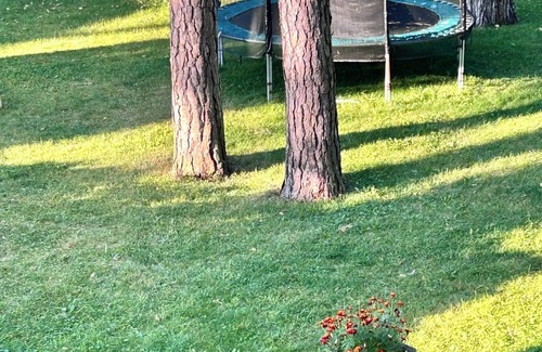 Large shared backyard with a trampoline and kids’ swings