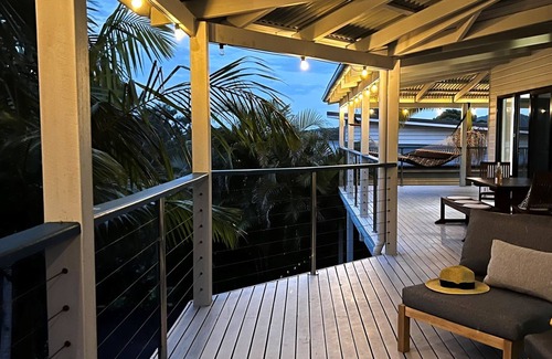 Spacious, modern, stylish beach house is an idyllic elevated position with views to the lake, ocean and national parks. A few minutes walk to the beach. The expansive deck captures sea breezes, perfect for relaxing and enjoying a BBQ.