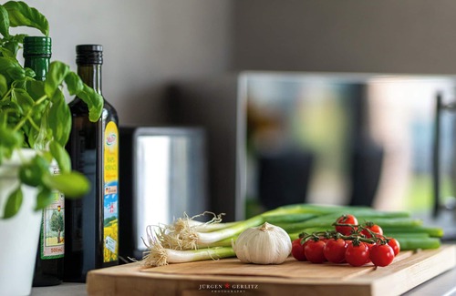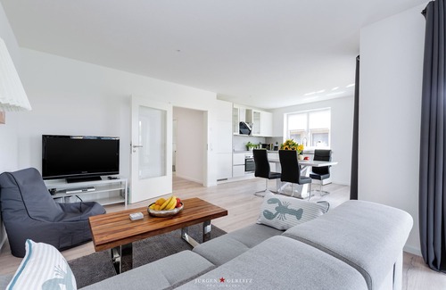 The house is equipped with everything that makes your holiday perfect. The floor-to-ceiling windows in living and sleeping areas provide plenty of sunlight, even in the reading area in the additional bay window. The first bedroom has a large box-spring double bed, the second bedroom has 2 single beds; It is possible to occupy up to 4 persons. The fully equipped, high-quality kitchen invites you to cook and offers with integrated dining room with 4 seats a beautiful space.