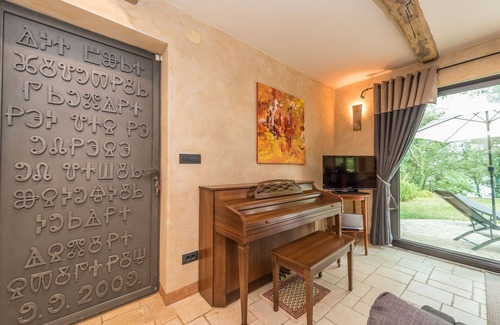 On the ground floow we offer a spacious living room with majestic cheminee and open space kitchen. White marble floor from Istria that Venetians used to build their beautiful city in the antique times. Finely decorated walls by renowned local artisan that used special technics and material such as organic mud from the area to mix up the brown color tonalities. Build-to-suit kitchen wooden furniture made of aged oak from Slavonia (far East Croatia). Most famous French wine and cognac producers use this very special wood, known for its robustness and special fragrance, to build their bariques. Brand new kitchen equipment from top brands such as two fridges, oven and dishwasher. Best quality kitchen supplies and accessories.