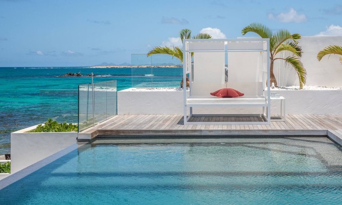 The long heated infinity pool, will allow you to contemplate the magnificent Cul de Sac bay with its different shades of turquoise water while having a swim.