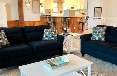 Mid level: Includes a king master bedroom with a Jacuzzi tub, a queen master bedroom with an on suite bath, a queen bedroom and a double bunk (4 twins) bedroom that share a bath. Large rear deck with a hot tub is accessed from hall and queen master bedroom. The mid level front deck with hammock can be accessed from the other queen bedroom or the king master. Laundry area is on mid level with washer and dryer.
