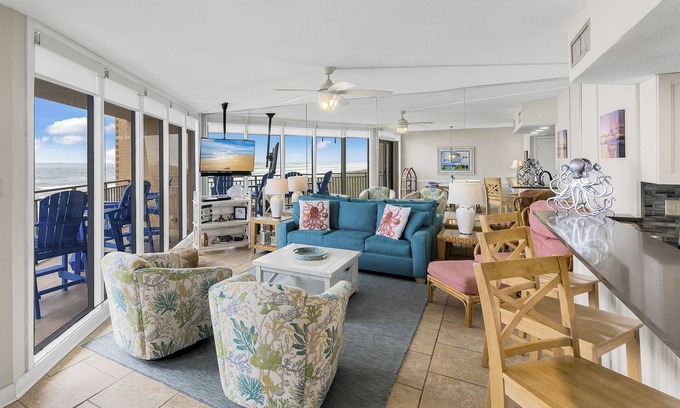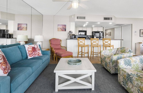 Sea Gull Condominiums unit 503 is ideally located on the fifth floor providing exceptional panoramic views of Mustang Beach and the Gulf of Mexico. We are “on the beach,” with access just a few steps across the boardwalk; beach towels are provided.