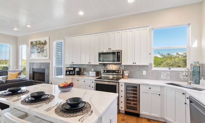 When you’re ready to relax, enjoy the villa’s modern amenities, including a fully equipped kitchen with quartz countertops and high-end appliances, a cozy fireplace in the master suite, and two spacious workspaces for those who need to stay connected. The master bedroom features a luxurious ensuite with a Jacuzzi tub, dual vanities, and a walk-in shower.
