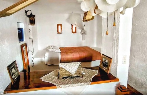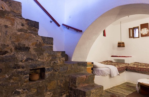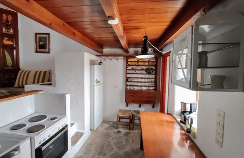 The 1905 traditionally built stone house combines rustic features with luxurious features. Rebuilt in 1930 and again when it was bought by the well-known architect Theodosopulos in 1965, who restored it. The interior of the features exposed brickwork, wooden beams and elegant furniture, creating a warm and homely environment. It can accommodate up to 4 persons in 2 different areas. A/C included. Entering small courtyard with flowers. In the home dining area with table and kitchen with all utensils. Then the sitting area with fireplace and further the first bedroom with two single beds plus fireplace. Few stairs up and you are on the mezzanine floor and master bedroom with matrimonial bed. The door to the right leads you to the covered veranda with dining table to sit six adults and summer kitchen. Outstanding sea view, the port of Elounda and beaches.