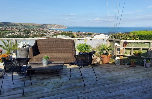Modern centre lounge Lodge offering spacious accommodation with views of Purbeck hills and Swanage Bay. Central location in walking distance of amenities and beach. Large deck & garden with heater, fire pit & seating areas.