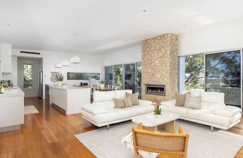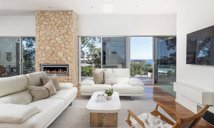 Two outdoor entertaining zones make holiday living easy. Sip sunset cocktails or enjoy alfresco BBQs on the elevated balcony with breathtaking panoramic views over the bay. Inside, the limestone gas fireplace invites cozy evenings after a day of adventure—perhaps a hike up nearby Mount Tomaree.