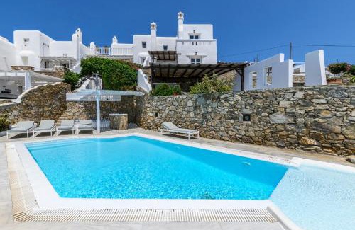 Seablue Villas Mykonos is a complex of four villas, located in Houlakia, high above the hills in Mykonos, offering panoramic views of the sea. Free WiFi is offered. The property is 2.6 mi from the center of Mykonos. The villas are built in traditional Cycladic architecture, decorated in white and blue tones and feature elegant furniture. The villas are set amid landscaped gardens, terraces, two private pools and a shared pool. Mykonos windmills and Little Venice are approximately 4.3 mi from Seablue Villas. Psarou Beach is reachable within 6.2 mi. Mykonos Airport is 3.7 mi from the property.