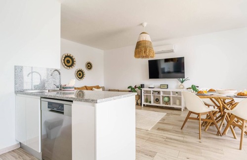 The apartment’s interiors reflect a relaxed, natural style with warm tones, soft textures, and thoughtful details that create a calm and inviting atmosphere. The open-plan living area is filled with natural light and features a cozy lounge space with a Smart TV and air conditioning, ensuring you stay cool and connected throughout your stay. Large glass doors open onto a lovely private balcony where you can enjoy your morning coffee, dine al fresco, or simply soak up the peaceful surroundings.