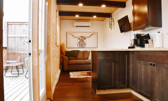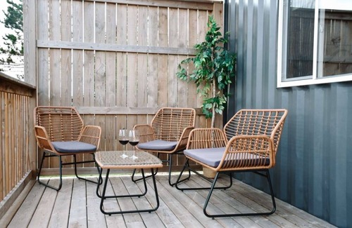 Inside your container, you'll find a stylish, living space with a comfortable bed, a compact kitchen, and a modern bathroom. Relax in the hot tub or gather around the fire for a night of stargazing