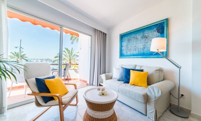 This modern and cozy flat, perfectly designed for two guests, boasts an unbeatable seafront location in the vibrant heart of Puerto de Alcudia. Enjoy spectacular sea views from the furnished balcony, an idyllic spot for quiet dinners or simply relaxing while watching the boats drift by. The balcony features a table for two and a sunbed, creating a serene oasis to soak in the coastal beauty. Inside, the elegantly styled living room includes a dining table, satellite TV, and a comfortable sofa bed for added flexibility. Air conditioning keeps the space cool during warm days, while the fully equipped kitchen—with a modern breakfast bar—offers everything needed for convenient meal preparation. The bedroom, complete with a double bed, also showcases stunning sea views, and the bathroom includes a shower for your comfort. High-speed Wi-Fi is available throughout the flat to keep you connected. Situated just 500 meters from the beautiful Alcudia beach and within walking distance of local bars, restaurants, and shops, this flat offers the perfect blend of luxury, comfort, and convenience. Experience an unforgettable stay in Puerto de Alcudia, where every detail is thoughtfully crafted to make your holiday truly special.