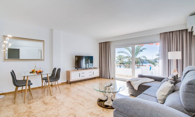 This beautiful holiday apartment in the heart of Puerto Alcudia offers the perfect blend of comfort, views, and coastal charm. Designed for up to four guests, the apartment boasts a spacious terrace with sweeping sea and mountain views—ideal for enjoying your morning coffee or evening meals while the sun dips below the horizon. Equipped with a dining table and sun loungers, the balcony is your private oasis for relaxing in the Mediterranean breeze. Inside, the apartment features a bright and airy living area with a Smart TV, air conditioning, and a dining table for four. The separate kitchen comes fully equipped with a dishwasher, ceramic hob, microwave, and oven—perfect for home-cooked meals after a day at the beach. Two cozy double bedrooms, both air-conditioned and fitted with wardrobes, promise restful nights, while the sleek bathroom with shower adds to the comfort of your stay. Located directly on the promenade, this apartment puts you steps away from Puerto Alcudia’s restaurants, cafés, shops, and scenic coves. Whether you're sunbathing, exploring the coastline, or dining seaside, everything is within easy reach. With its unbeatable location and homely feel, this seafront retreat is your ideal base for a relaxing and memorable holiday in Mallorca.