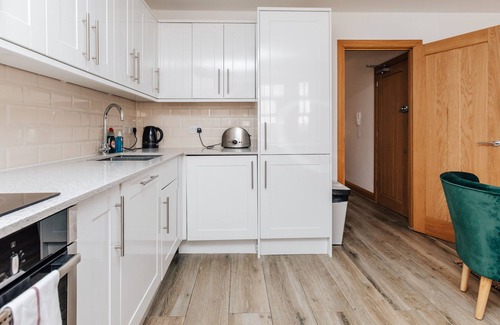 The smart, open plan kitchen comes fully equipped with a hob, oven, toaster, kettle and a fridge freezer, perfect for rustling up a lazy breakfast or preparing a full family meal. Between the kitchen and living area is a dining table with seating for four.