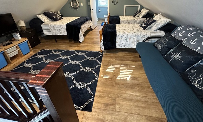 Bed 3: (Second Floor Loft) 1 Queen, 2 Twins, 1 Full Futon Sofa. Approximate room size 19' x 22'.