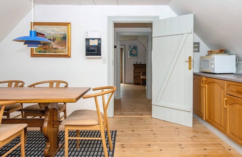 Apartment located on the 1st floor of old Fanø farm, where there is a view of the Wadden Sea and the old town Sønderho. On the ground floor there is an entrance hall with washer and dryer and entrance to the 1st floor. On the 1st floor there is a kitchen in open connection with the living room. In the kitchen, the stove is located in the window niche, so you can enjoy the view of the area while you cook. The bathroom sink is also located in the window niche, so you can also enjoy the view of the area. The 2 bedrooms are located at each end of the apartment. One room has access to a small balcony from which you can see the Wadden Sea. There is its own small terrace for the apartment. Not for rent to youth groups.