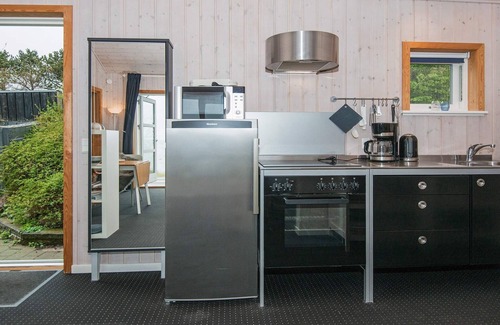 Layout: open kitchen(cooker(electric), hood, coffee machine, microwave, fridge-freezer), Living/bed room(TV(cable, german television channels, danish TV channels (DR1 and TV2)), radio), bedroom(double bed), bathroom(floor heating)(bathtub or shower, washbasin, toilet), heating(electric), terrace, BBQ, air to air heatpump