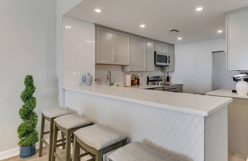The thoughtfully renovated and exquisitely decorated interior combines sophistication and coastal elegance that creates an ambiance to instantly put you at ease. Rest easy in the primary bedroom, featuring a luxurious King bed, while the second bedroom offers a Queen bed and a Twin day bed, providing ample sleeping space for your family group.