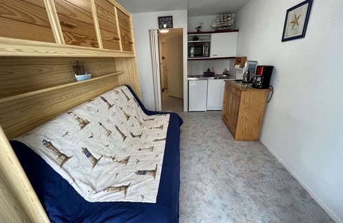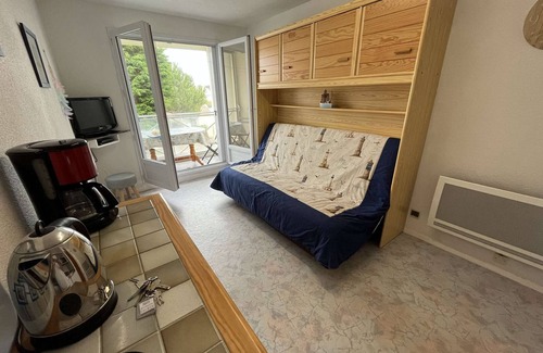 In St Hilaire de Riez, on the Vendée Corniche, in the La Corniche d'Or residence, this first-floor studio apartment is ideal for two people. It features an entrance hall, a living room with a double sofa bed (140 cm), a bathroom with toilet, a fully equipped kitchenette and television, and a veranda-balcony overlooking the countryside with garden furniture. Shops are 1000 m away. A small private garage is available. Tourist tax (rates vary depending on the number of people) and a security deposit are payable upon arrival.
