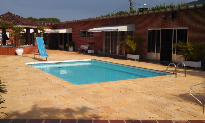 House with 5 suites with large TV room, kitchen with two refrigerators and household items, games room with pool table and card games, pool with sun loungers and a slide, showers, barbecue stove, soccer field, kiosk, garden, green area garage for 6 cars.