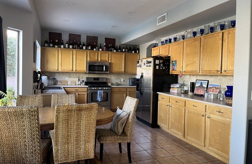 Very personalized casual and comfortable family home. Three bedrooms available. Sleeps 6 comfortably. Perfect for families; in fact - there are family photos posted all throughout this home that will be present during your stay. Linens and towels are provided. Laundry room is conveniently located upstairs with all three bedrooms. Master bedroom has a balcony. House is north/south with the backyard facing north. There are No two stories next to us - so you have privacy in the backyard.