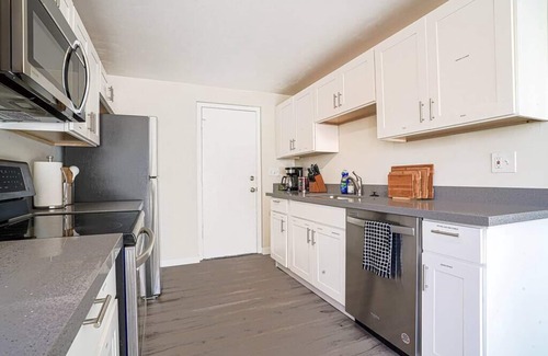 As you walk through the front door, you'll enter the spacious kitchen and dining area. The two bedrooms are located in the hallway (1 King and 1 Queen), as well as the full bath and washer and dryer laundry room. At the end of the hallway is the living room, where you can relax before or after your flight.