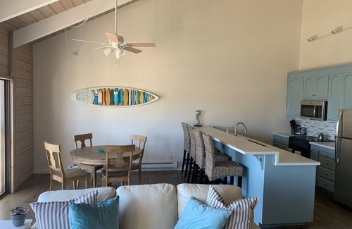 Spacious and modern two bedroom one bath condo with high ceilings and a fabulous ocean view! Look out at the ocean from the kitchen bar, living room, and hallway. 150 steps to the Beach, Capitola Pier, boutique shopping and over 20 restaurants. Remodeled kitchen, WiFi Big Screen TV and a private back patio with a gas BBQ grill. Perfect for families, couples or girls/guys getaways! Sleeps 5 comfortably. Covered parking for 1 car, dirt parking for additional car. Also - for renters looking for properties that sleep more then 6 people, our Capitola Breeze Condo (Listing# 1469178) is right next door and sleeps up to 6 people so if you have a large party (more then 5 people) you can rent both condos and the back patios can connect through a gate in the back fence (which can be opened if renting both units). Perfect for extended families and/or friends traveling together.