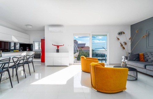 Seaview villa Lea is a high-quality furnished, modern, and comfortable accommodation that boasts 180 sqm of living space and can accommodate 9 people. It consists of two comfortable units on two floors (each 90 sqm) both with a fully equipped kitchen and living area, and both units are offered for one group. It is set on a 340 sqm fully fenced property from where you can admire the beautiful landscape and spend your best vacation ever in this stylish accommodation. Villa Lea offers all modern guest needs for a very comfortable stay, two fully equipped kitchens with all the appliances, each room with a TV, free Wi-Fi, fully air-conditioned, and a Playstation3 with many games for your youngest (or everyone that feels young). Located only 1 km from the beach, 700m from the Makarska center, and 700 m from restaurants and shops, it allows enjoying in quiet and friendly surroundings, still very close to various offers that the town Makarska provides.