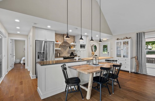 Bunkhouse: A modern four-person seasonal bunkhouse features two sets of bunk beds. The overall aesthetic is cozy yet functional, providing additional sleeping arrangements for large groups, or a cozy bunkhouse for the kids! *Please note that the bunkhouse is not winterized and only available during the summer months!