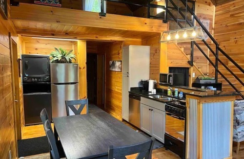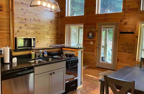 The cabin includes everything you need for a comfortable stay: a fully equipped kitchen with coffee and snacks, washer and dryer, dishwasher, high-speed Wi-Fi, streaming services, classic arcade games, and more.