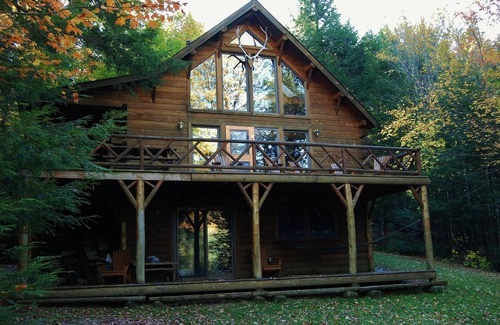 Your vacation home is Running Deer Lodge, a lovely cedar log cabin chalet on the edge of one of the most private and secluded lakes in this wilderness park. See more deer, beaver, osprey and loons, than you will people. Authentic furnishings in a Great Camp tradition throughout. Three bedrooms (and an overflow sofa bed in the lower den), enough for two families and children. A wall of glass opens the cathedral ceiling living/dining area to the lake, mountain views, and sunsets. Fully equipped modern kitchen, a den, 3 rowboats, 2 canoes and dock.