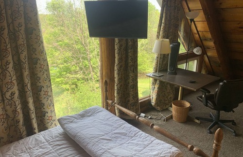 Humming Bird Hill - Log House lodging that provides a unique escape for travelers who want to reunite with nature. The perfect spot for your family gathering or getaway with friends with all of the luxuries of home. Relax, meditate, and unwind in this authentic log cabin house with a huge wrap around porch. Relax and soak in the breathtaking views of the surrounding hillsides. Spring fed ponds and 100 acres of woods with trails. The whole Log House is yours to enjoy. There are 100 acres of woodlands with mowed trails and a few open mowed fields. Feel free to walk, hike, and explore. The Lodge is the building on the pond, you are welcome to visit. You will find me there.