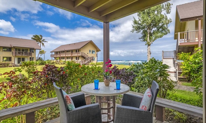 Hanalei Colony Resort E1 - modern ocean view apartment in north shore Kauai's only true beachfront resort, recently voted one of Travel + Leisure's top 20 favorite resorts. These unique Hanalei vacation rentals are just steps away from the secluded sandy beach that fronts the property! Opakapaka Bar and Grill is just across the parking lot, as is the Hanalei Day Spa if you're looking to pamper yourself. Just a few minutes past the charming town of Hanalei, you'll find that shopping and dining options are conveniently close. It's the perfect Kauai vacation rental for proposals, honeymoons, anniversaries, and other romantic occasions.