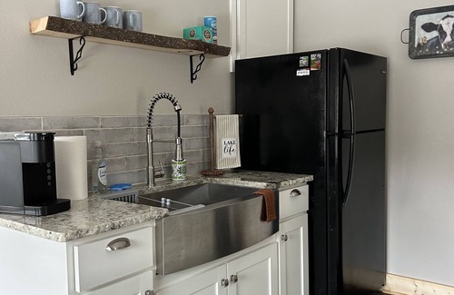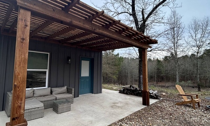 This mini barndominium on a private 10 wooded acres with high speed fiber optic internet is the perfect retreat. Close to Lake Bob Sandlin and Lake Cypress Springs. Come escape and relax around the fire pit or explore the trails. Everything needed to enjoy your stay including kitchen with everything needed to cook, wood burning stove and outdoor grill. Wildlife and amazing views of the woods right from the porch. Comfy queen bed with roll out twin underneath. Plenty of options for dining and shopping in nearby Historic Main Street Pittsburg and Winnsboro. Security camera located on front pergola facing parking area.