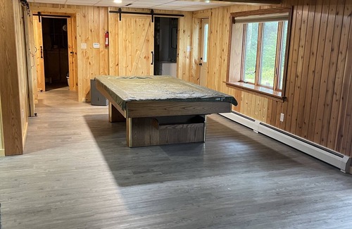 Beautiful 3400 sq ft cabin with mountain, sunrise, & sunset views on 84 acres with a pool (seasonal), large outdoor deck & patio with firepit. Large pavilion with picnic tables off of pool area. Lots of wildlife can be seen from the deck & patio. 5 Bedrooms and 2 full bathrooms in the main house with an additional 2 bedrooms and 1 full bathroom in the bunkhouse. Sleeps up to 17 people. Pool table, air hockey table and foosball table!