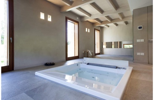 Outside there is, perfectly integrated into the green garden set in an open hill scenario, a heated swimming pool with a therapeutic path. The open space allows you to lie down on one of the sun loungers or to walk around the house for a while or, again, to indulge in yoga classes or practice various outdoor sports. The Villa also has a nice patio with sofas, a barbecue area all in a fenced plot of about two hectares.