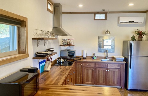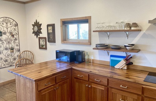 Downstairs has a large, very well equipped kitchen (no dishwasher) with cherry cabinets, repurposed cedar wood butcher block counters with 4 oak swivel bar stools, a round oak table and stainless steel appliances. Under the stairwell is cushioned seating with storage underneath. The stairs feature drift/curly vine wood railing.
