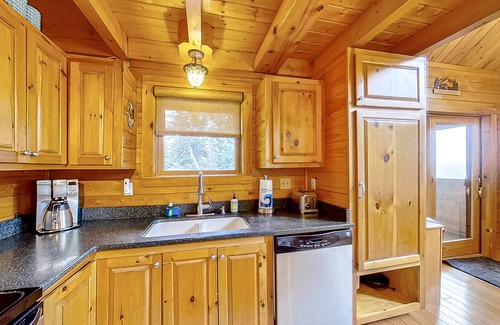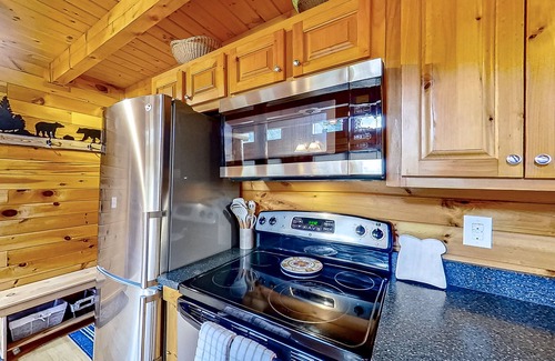 As soon as you enter the main home, you will be greeted by a beautiful and bright open floor plan with high cathedral ceilings, exposed wood beams, and floor-to-ceiling windows flooding the space with natural light. Wind down by the warmth of the wood stove as you read a favorite book, play any of the provided board games, or plan your next adventures with your loved ones. The kitchen is fully equipped with all the essentials to prepare delicious homemade meals for everyone. Attached to the main living area is a beautiful sunroom, which comes in handy after a terrific day exploring all the nearby amenities. If you are in need of cooling down, take a refreshing dip in your private heated pool. When the sun sets, make sure to throw some logs into the wood-burning firepit for an entertaining storytelling session while roasting s'mores. Back at the home, the downstairs level enjoys a welcoming rec area with a smart TV and a desk and a laundry room with a washer/dryer.