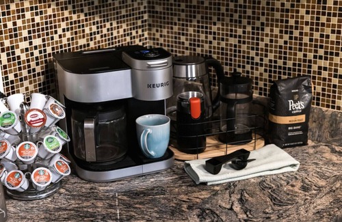 ✓ Coffee: K-Cups, ground coffee, Keurig, drip pot, and French Press