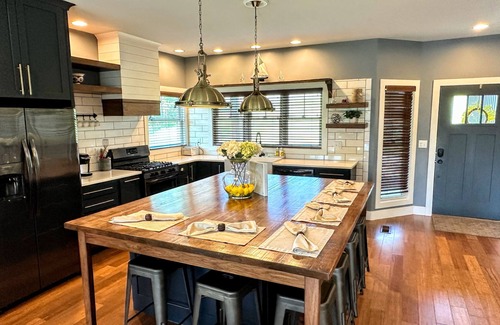 Fully stocked kitchen, 4 Bedrooms- 2 king beds, 1 Queen, bunk beds and daybed with trundle (twins), 3 full baths, washer/dryer, back yard fire pit, gas grill. Activities in the basement include foosball, 3 arcade games (NBA Jam is 4 player, X-men is 2 player, and Golden Tee for the husband) board games, and a full toy chest for the littles. Things to bring: favorite coffee (keurig and coffee pot available), firewood.