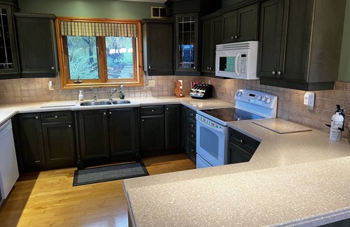 The dining table seats 8-10 with 2 stools at the nearby kitchen island. Full kitchen features refrigerator/freezer, dishwasher, oven, microwave, toaster and drip-coffee machines. Prepare your own dinner in the full kitchen or enjoy takeout from one of the local restaurants in style.