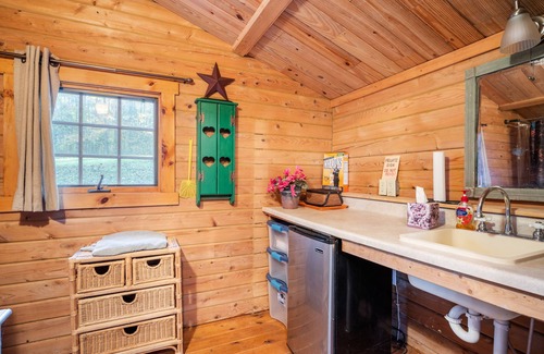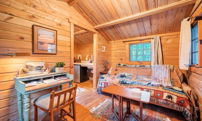 A quaint 200 square foot cottage nestled in a secluded corner of the grounds. Features a sofa bed, bathroom, kitchenette and outdoor firepit - very cozy for one or two occupants. This cottage does not have drive-up parking. Perfect for adventurous visitors who don't mind a short hike to enjoy complete privacy. This is the perfect add-on to our Lost River Lodge listing #2553695.