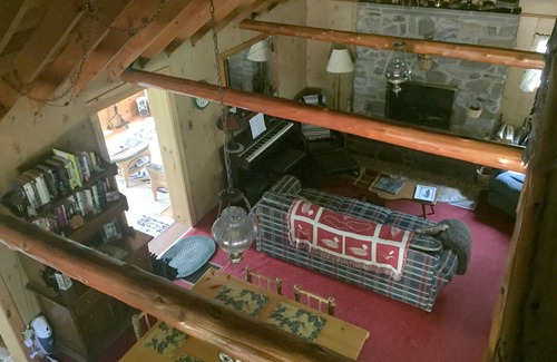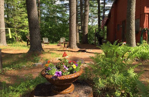 Distinctive log house amid pines above 75-acre lake reached via log stairs. Private 200-ft lakeshore beach, raft, rowboat, canoe, kayaks. 4 BR's sleep 7. Sunroom, living rm, deck, wash-dryer, gas grill, fireplaces. Hammock, badminton, pingpong, board games, puzzles, toys, 40" TV. Reliable/fast WiFi (broadband). 9 mi from Northway. 4-mi bike ride to athletic fields & country store. No pets. Alas, exposed balcony makes house unsuitable for toddlers. 3 BR's have curtains not doors. Must rent in 7-day blocks.