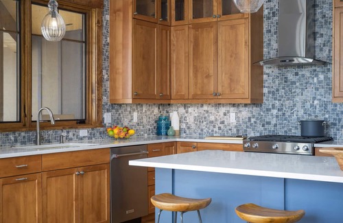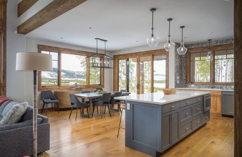 Enter the home and have your breath taken away by the large vaulted ceilings and wrap around windows revealing sweeping mountain views. In the living area, enjoy the large flat screen TV and fireplace. Relax and unwind on the plush furnishings and enjoy conversations with your group with the ample seating. When there is a need for fresh air, exit the living room onto the enormous, partially covered patio that wraps around the back of the home. On the deck, you'll find a private grill and enjoyable patio furniture and a gas fire pit, perfect for a morning cup of coffee or dining al fresco. The polished modern kitchen boasts a gas stove, stainless steel appliances, modern lighting, and soft white granite countertops that provide plenty of space for the chef in your group. The dining area has a large table with seating for up to eight and overflow seating at the breakfast bar with room for four.