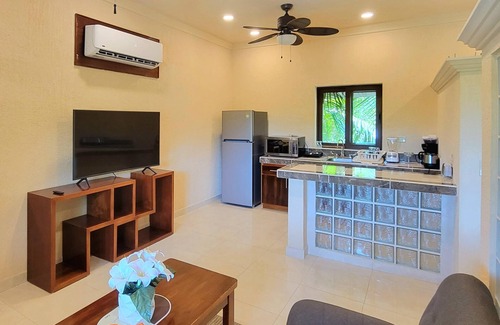 The kitchen area comes complete with a refrigerator, microwave, toaster, blender, coffee maker, and hot plate.