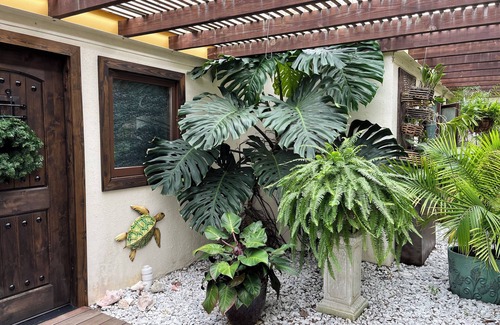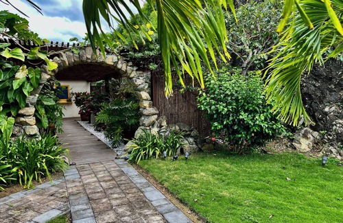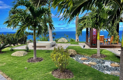 Framed by Asian and West Indian architecture, this tranquil retreat off the beaten path, includes a Japanese gazebo, jacuzzi, and a garden courtyard filled with tropical flora. A wood walkway through the courtyard leads to the private guest entry and studio apartment, complete with a full kitchen, tiled bath and spacious living area. A private covered veranda provides 180 degree ocean views of the Virgin Islands and St. Croix's Salt River Bay and Buck Island. Our northern orientation at 450' elevation above the shoreline provides constant easterly trade winds, making for comfortable days and cool nights. Morning sunrises are magnificent and night skies unspoiled by city lights. Our mid-island location affords island-wide convenience: 7 miles to Cane Bay Beach, 6 miles to historic Christiansted; and 12 miles to the Frederiksted and the western beaches.