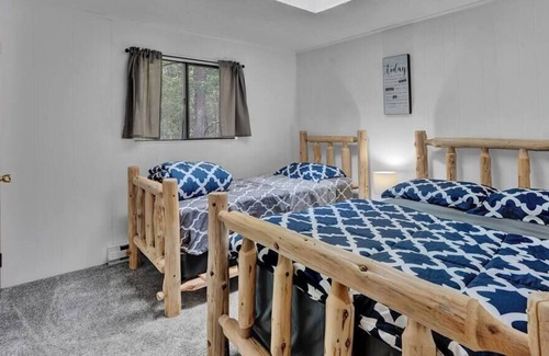 The lower level features a second living space and smart tv, additional bedrooms, and a blue felted pool table. Get ready to enjoy a premium Pocono experience!