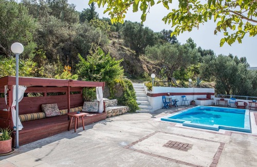The house of Margarita was a wonderful discovery. We had the self-contained top floor with a conservatory entrance which led directly onto the terrace and private pool with wonderful views of the surrounding countryside. We saw eagles, vultures and hawks every day. The main, double bedroom has a terrace overlooking the front of the house giving another beautiful view and morning shade. As described in detail in our place.. ...myhousetorent... The house is unique and full of Margarita's own work art and spiritual warmth - she's a doll maker. The short road leading from the village is steep and takes a bit to get used to and while the house does not have 5 star luxury, it is spacious, nicely decorated and I highly recommend it to those with a bit more Adventurous nature that aren 't seeking all the luxury and modern convenience. Margarita was warm and welcoming and invited us to look at her in a traditional room and provided many recommendations. She could not have been more helpful. When we did not want to drive, the 10 minute walk into the village of the local tavern on the square proved invaluable serving good portions of traditional Greek dishes at very good prices.