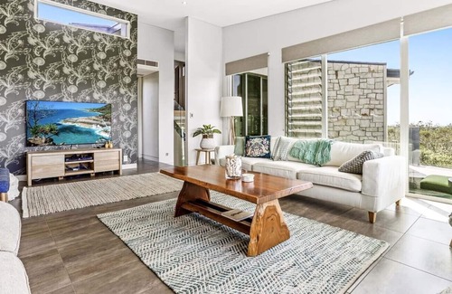 On the main level, the huge lounge room is wonderfully lit with windows on every side, high ceilings and incredible ocean and pool views. Gorgeously presented with a tasteful dandelion-papered feature wall, three comfortable couches, a coffee table and a TV, this is an idyllic, relaxed space for you and your guests. A powder room adorned with the same dandelion wallpaper is discreetly located behind the feature wall.