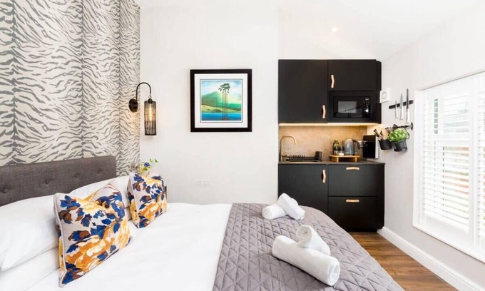You will be staying in a compact, stylish studio with a double bed with hotel style linens and towels. You have an en-suite shower room with a large walk-in shower. The mini kitchen has a single pan hob, microwave, mini fridge, kettle and toaster. It is well stocked with plenty of crockery and cooking utensils. If you require a full kitchen, please book one of our other units in the building. There is dining space for 2, which doubles up as a desk if WFH. Fast speed WiFi is free and reliable.