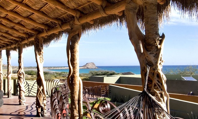 Only 200 feet by path from the beach, this is the second floor of a home with expansive windows to capture views of the Sea of Cortez and the desert mountains. 1 bedroom, 1 bath, kitchen, livingroom - all with breathtaking views. 4 decks including wrap-around with outdoor dining and finished rooftop. It's unique architecture features original Mexican art and craftmanship. Wheelchair accessible by ramp. Great beaches along a reknowned marine protected area providing great snorkeling and diving. Swim, mountain bike, surf, kayak, birdwatch - perfect for nature lovers. Cabo Pulmo is an eco destination using primarily solar power. Small dipping pool.
